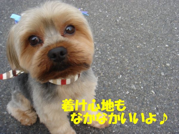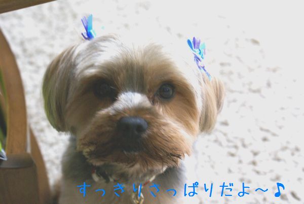 トリミングでつけてもらったリボンが青色
