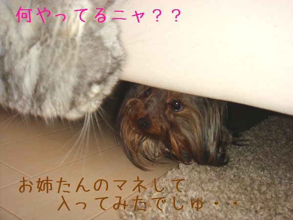 ミーニャのマネしてソファーの下にかくれんぼ